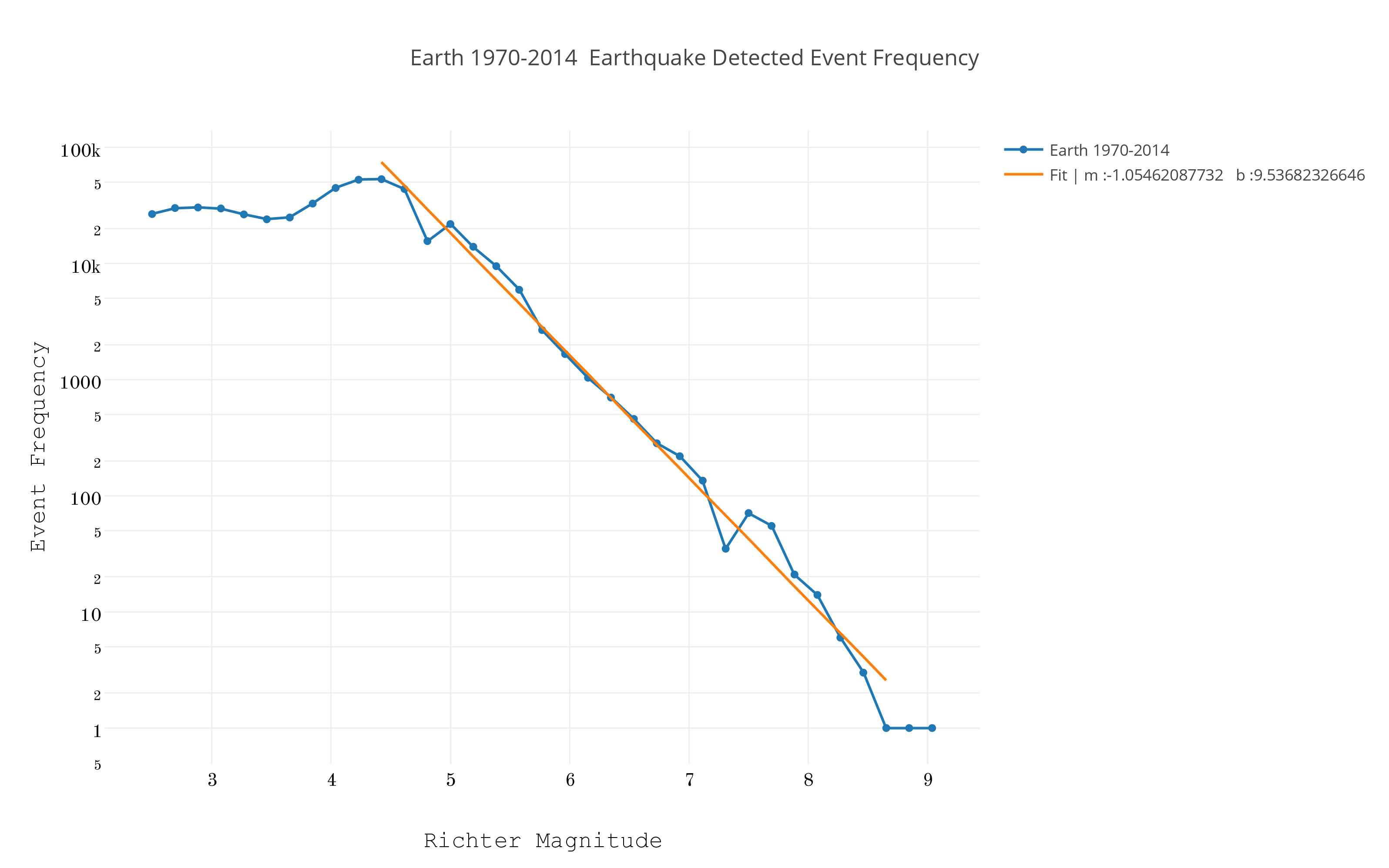 As observed by the last equation power laws will look linear in log-log axes. Many real world systems follow a power law but a famous example is that of the Gutenberg-Richter law in earthquakes. The following plot shows a histogram of earthquake data from 1970 to 2014 gathered by the US Geological Survey. There are deviations as seen in the initial roll off of small magnitude events but one does observe power law scaling for events larger than a 5.0 in the Richter scale. In this case the exponent tau is measured to be around one.
